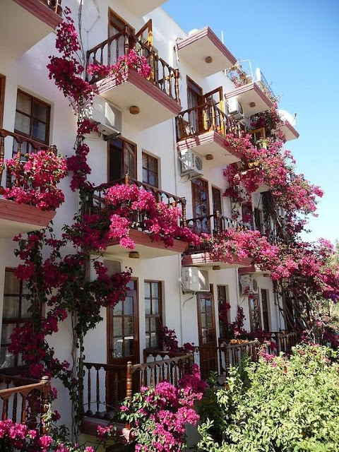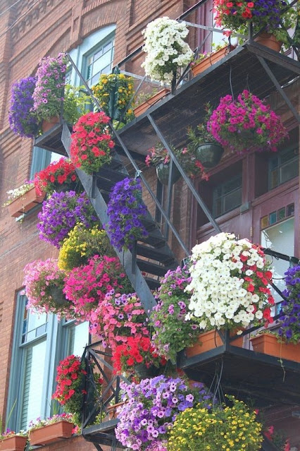 Ici même les escaliers de secours ont été décorés de belles fleurs!